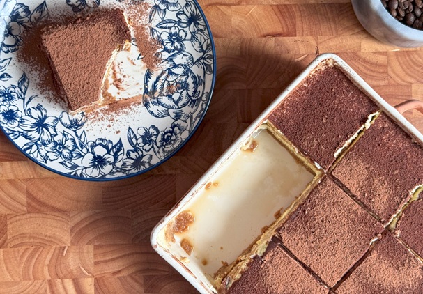 - Use a fine mesh sieve to dust the top of the tiramisu with alight layer of cocoa powder.